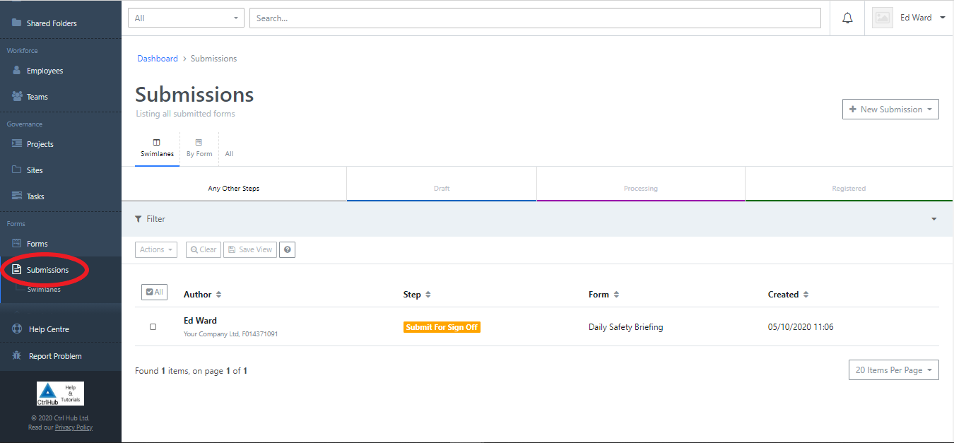 Listing Submissions Submissions are created when an user submits a form. To access the submissions listing, use the Submissions link in the navigation menu: Click on a row to view the submission.