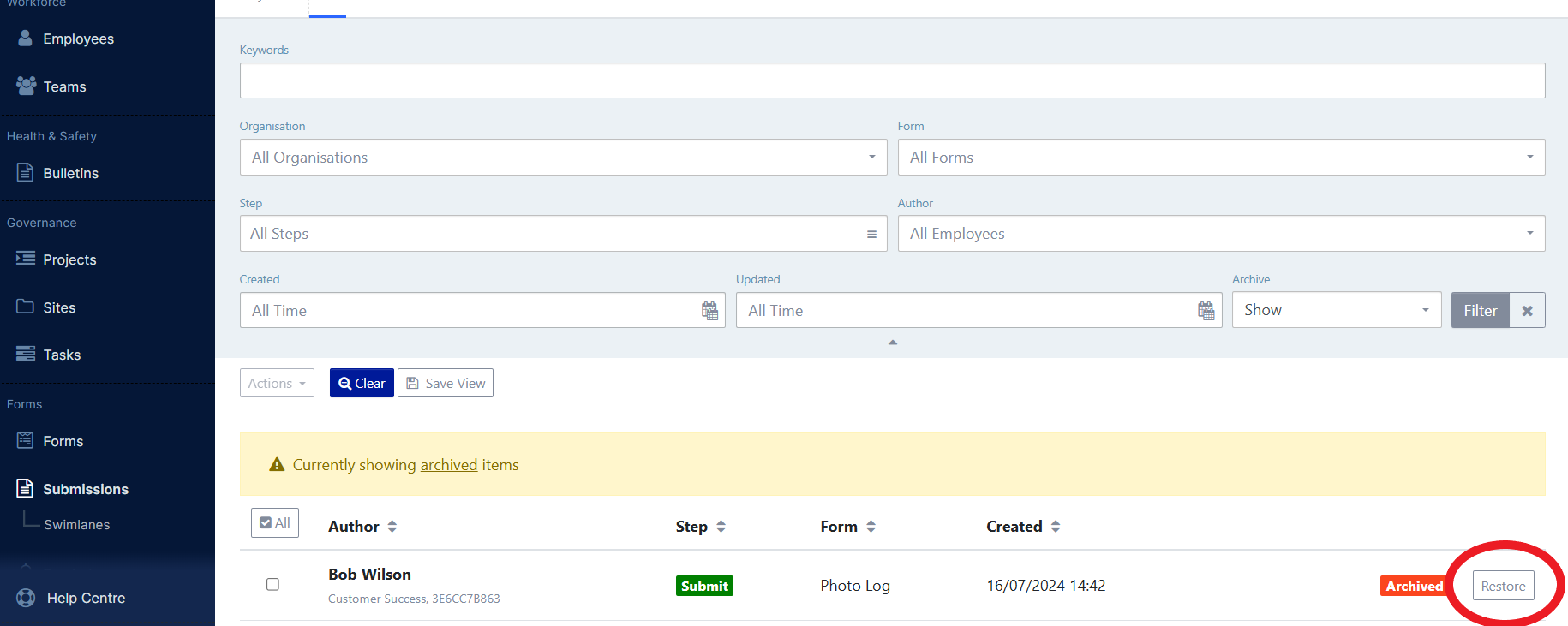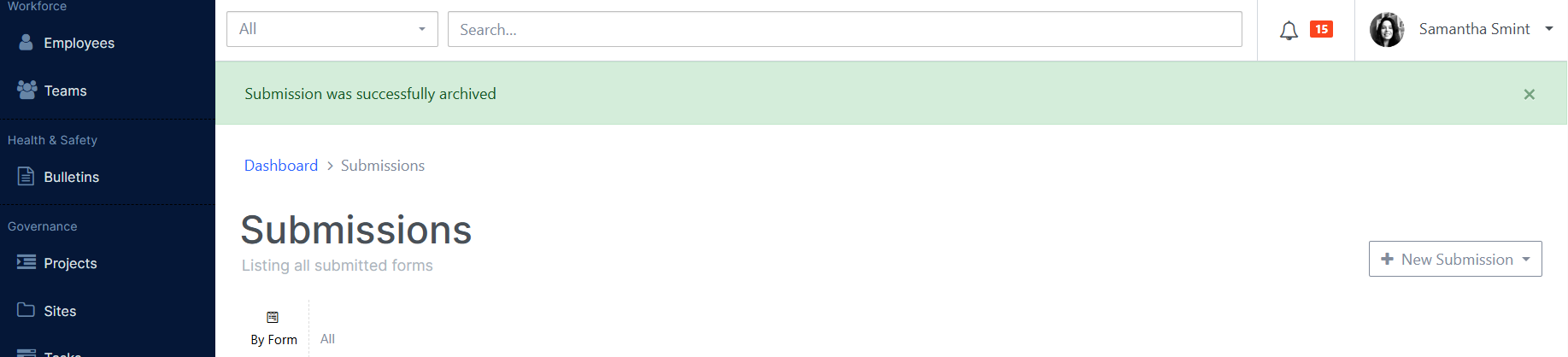 You will see a success message and the archived form submission will no longer be in the listing.