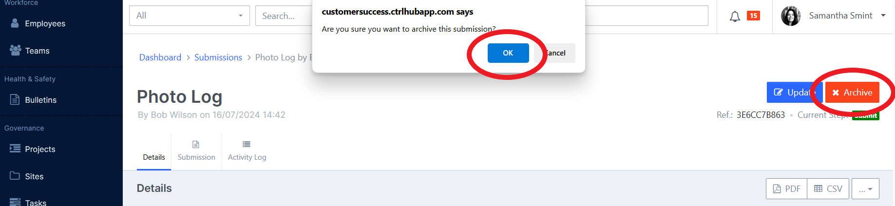 To archive a form submission, click the Archive button and OK to confirm: