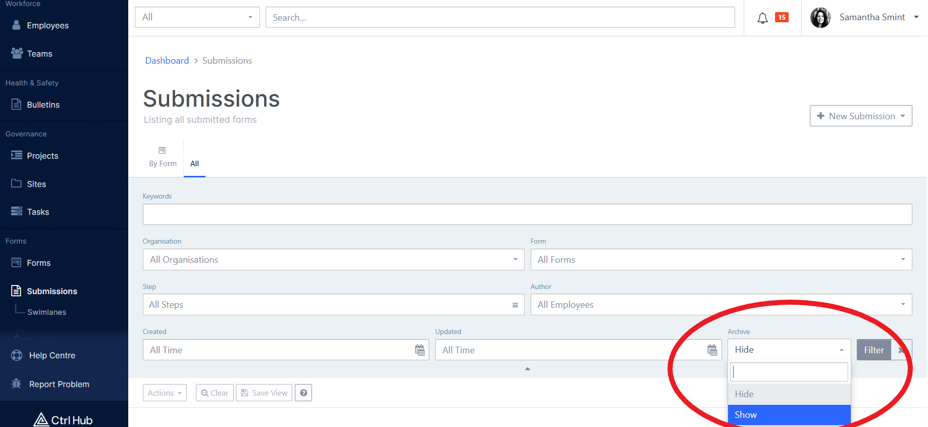 To retrieve an Archived submission, open the filter on the submissions page and select Show in Archive and Enter