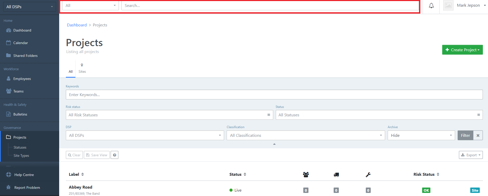 Now you can filter for projects using all of the available filters. When you’ve selected your criteria, click the Filter button to filter the projects. Click the Cross or Clear button to remove the filters: