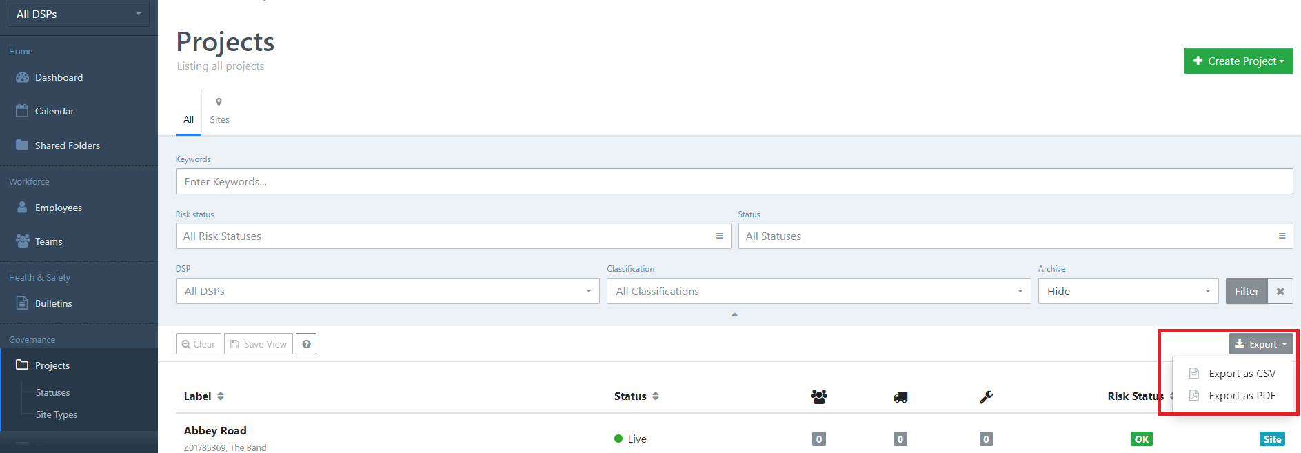 *Note* if you have any filters applied, the export request will only export the projects from your filter.
